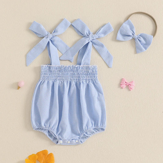 Baby Girl Plaid Print Romper Sleeveless Tie Strap Smocked Jumpsuit with Bow Headband