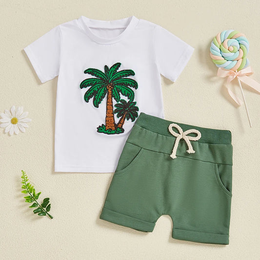 Toddler Boy Summer Outfit Tree/Excavator Embroidered Short Sleeve Round Neck T-Shirt +Solid Shorts 2Pcs Set