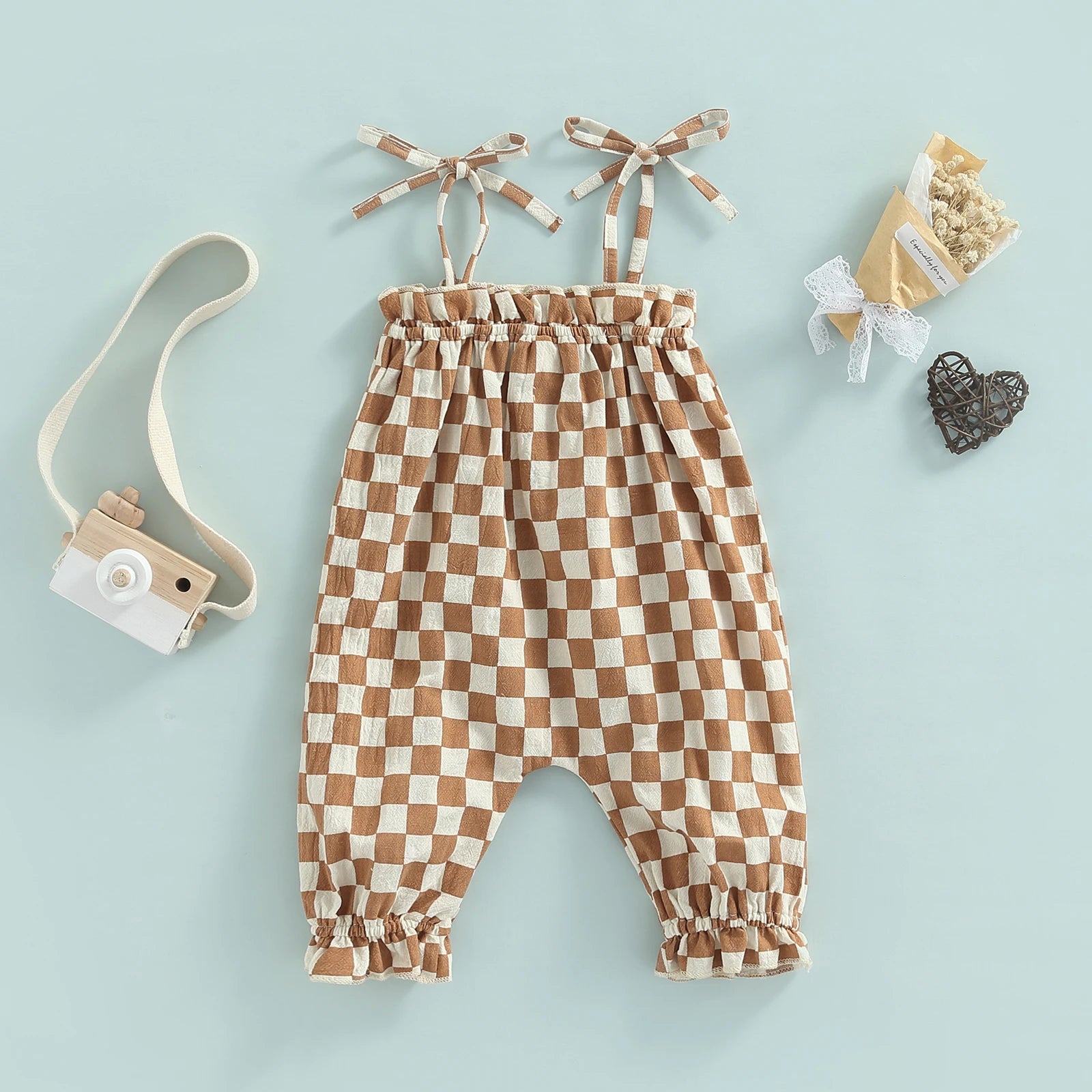 Baby Girls Casual Jumpsuit Brown Plaid Pattern Sleeveless Tie-up Strap Romper Summer Clothing
