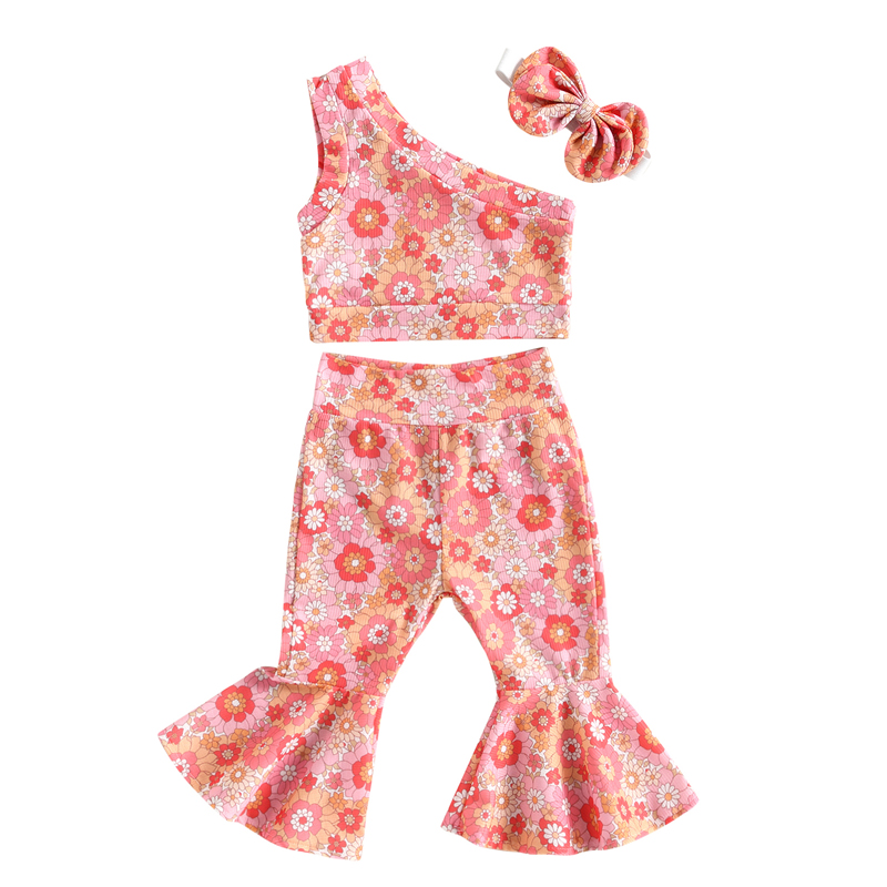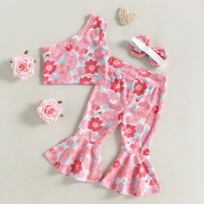 Toddler Girls 3Pcs Summer Outfit Sets Sleeveless One Shoulder Vest Floral Flared Pants Headband
