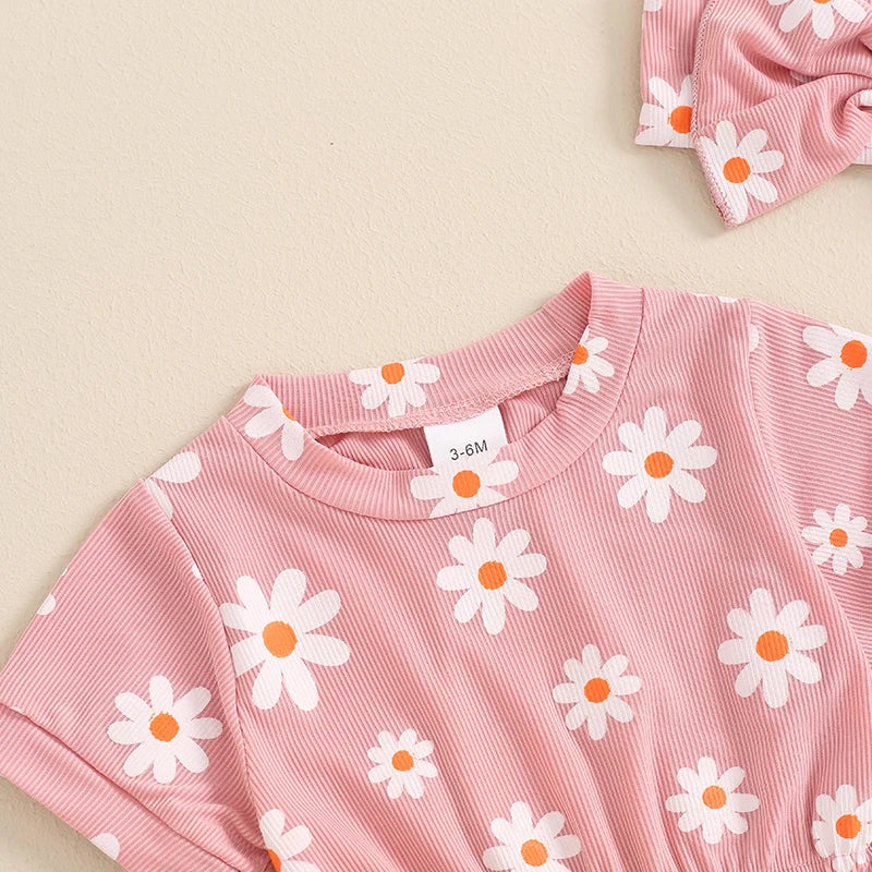 Summer Infant Baby Girls Rompers Short Sleeve O Neck Floral Jumpsuit with Headband
