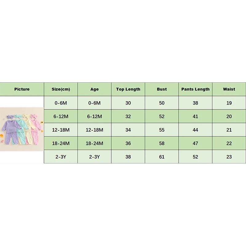 2-3Y Tops Length: 14.96 Bust: 24.02 Pants Length: 20.47 Waist: 18.11 Advised Age: 2-3 Years