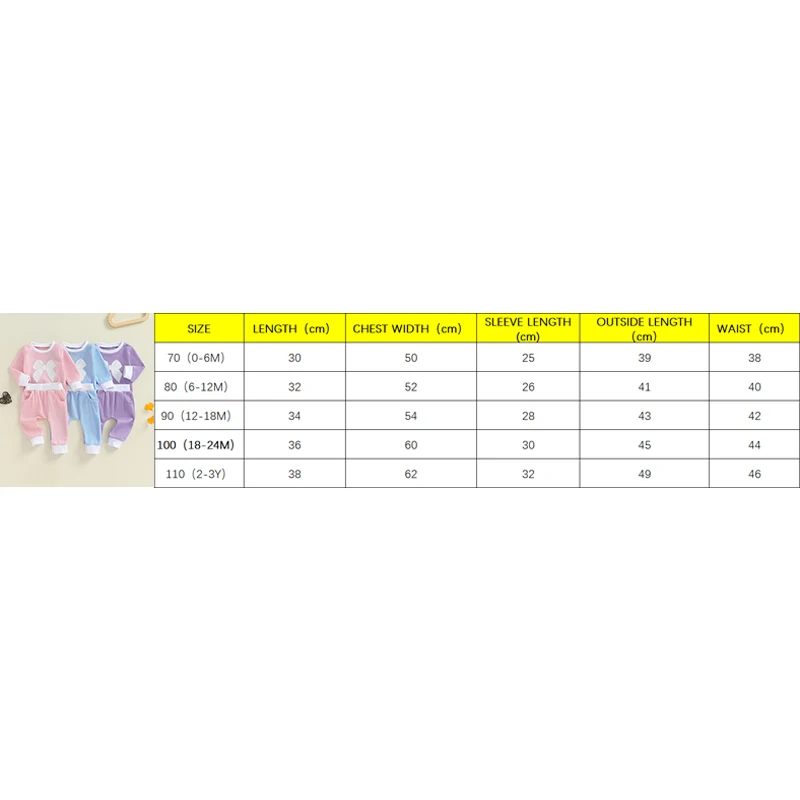 100 Tops Length: 14.17 Bust: 23.62 Sleeve: 11.81 Pants Length: 17.72 Waist: 17.32 Advised Age: 18-24 Months