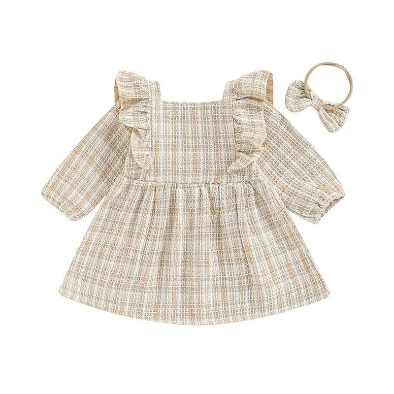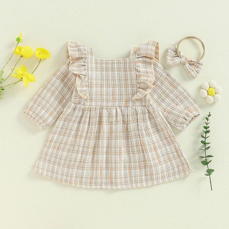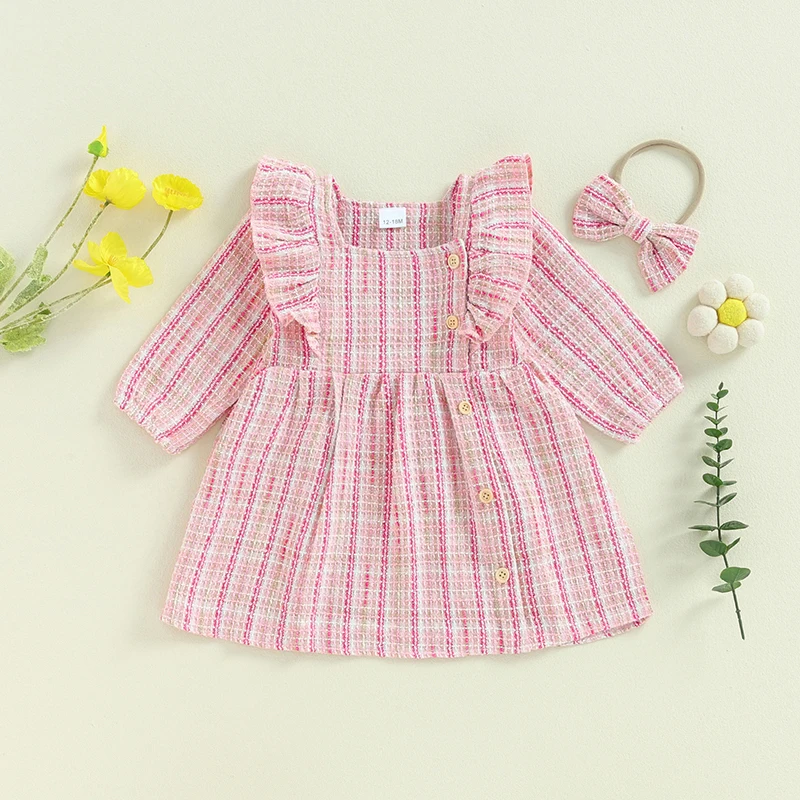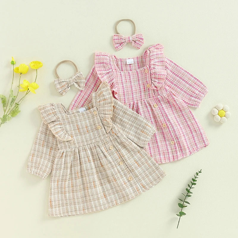 Toddler Girls Dress Square Neck Ruffles Buttons Long Sleeve Casual Fall Princess Dress with Headband