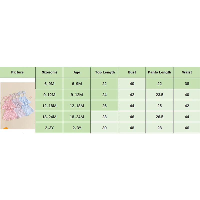 6-9M Tops Length: 8.66 Bust: 15.75 Pants Length: 8.66 Waist: 14.96 Advised Age: 6-9 Months
