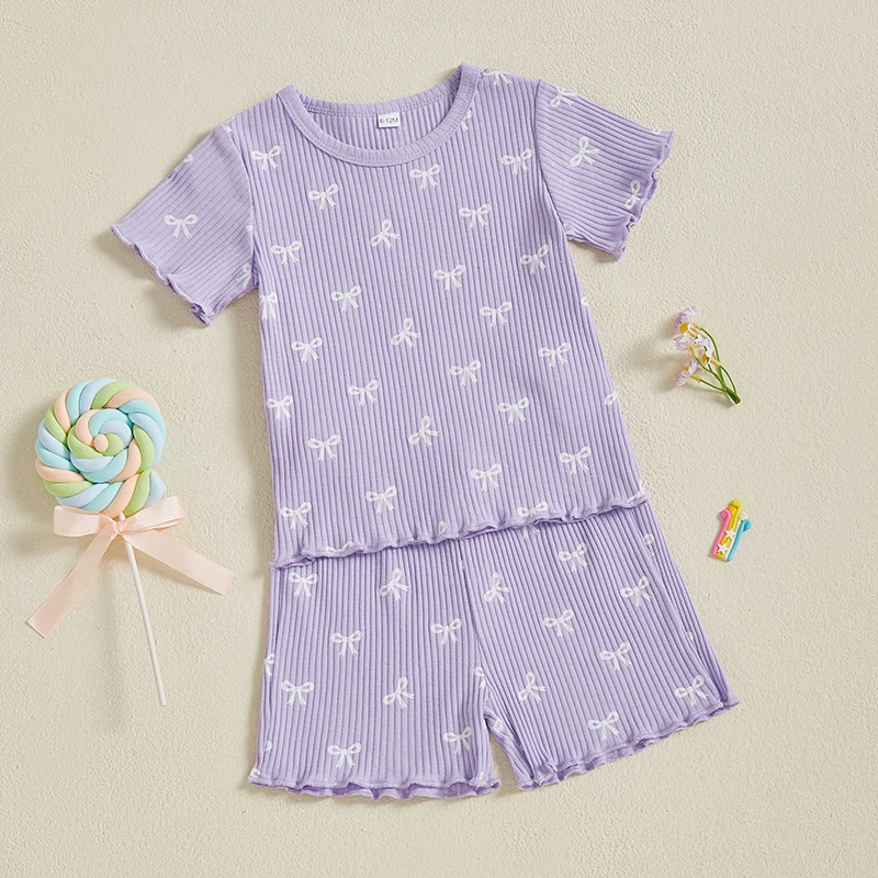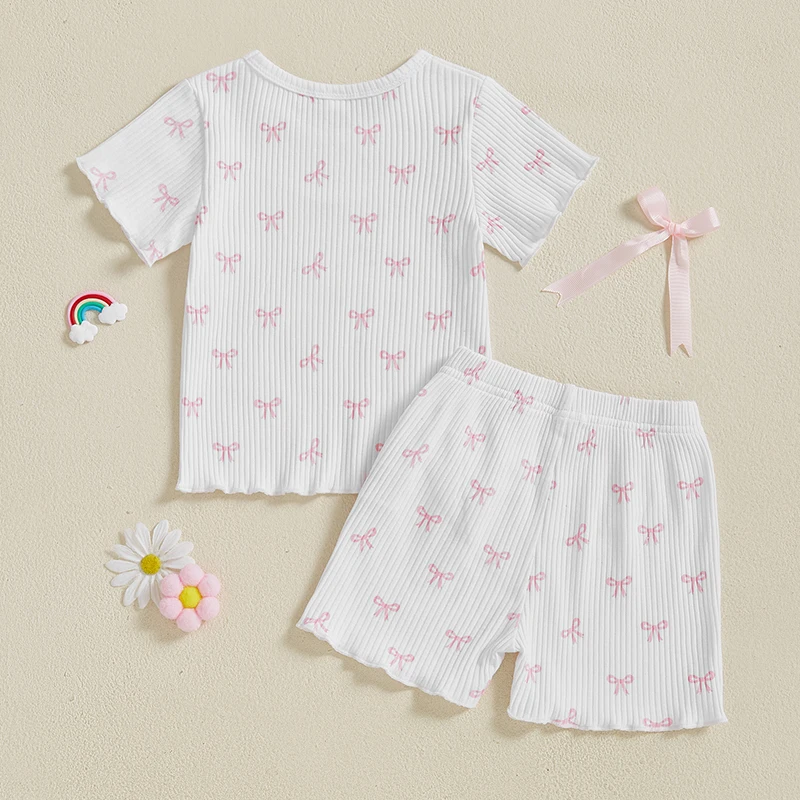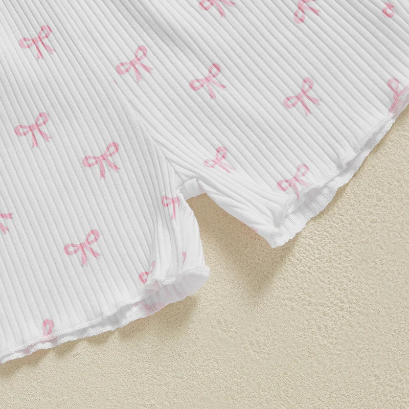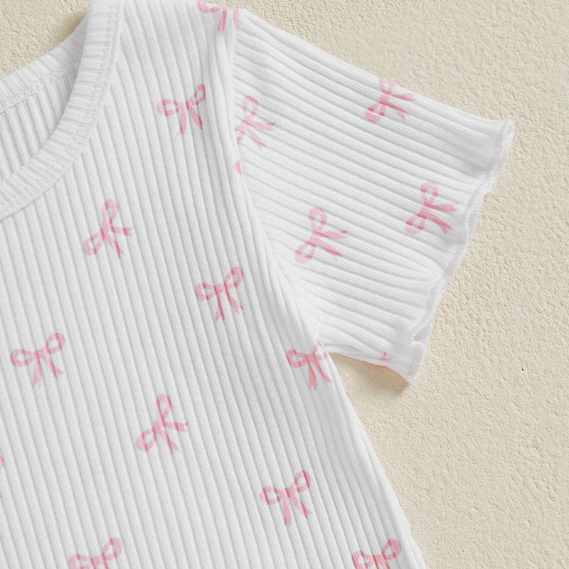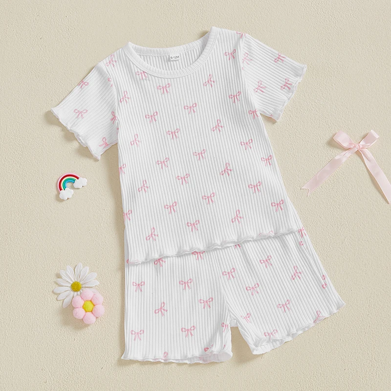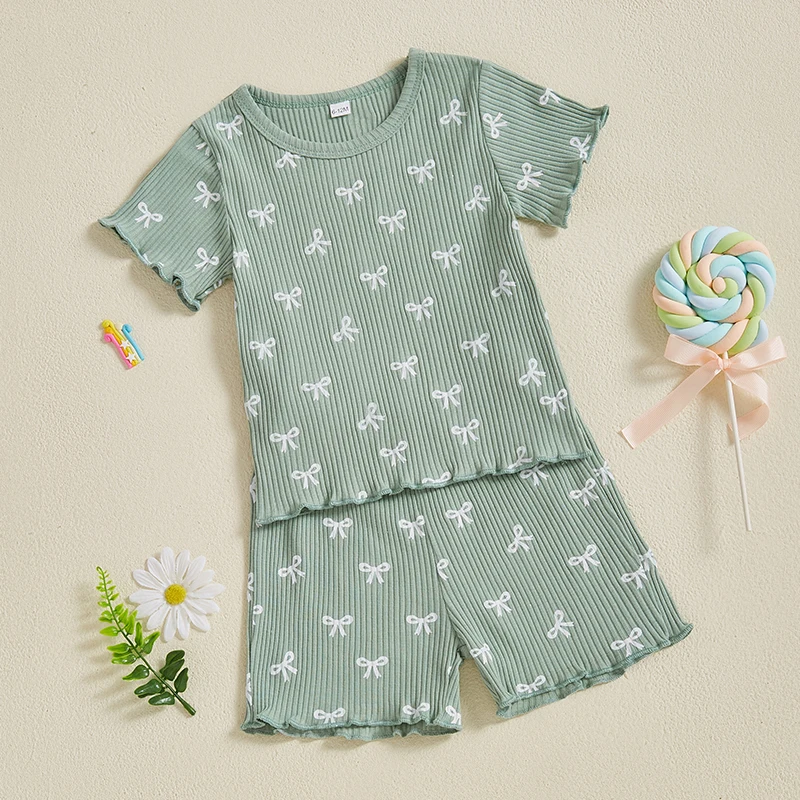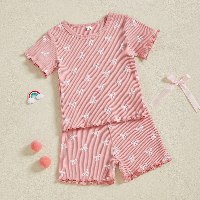 Toddler Baby Girl Bow Ribbed Outfit Lettuce Trim Short Sleeve Tops Elastic Waist Shorts Summer Set