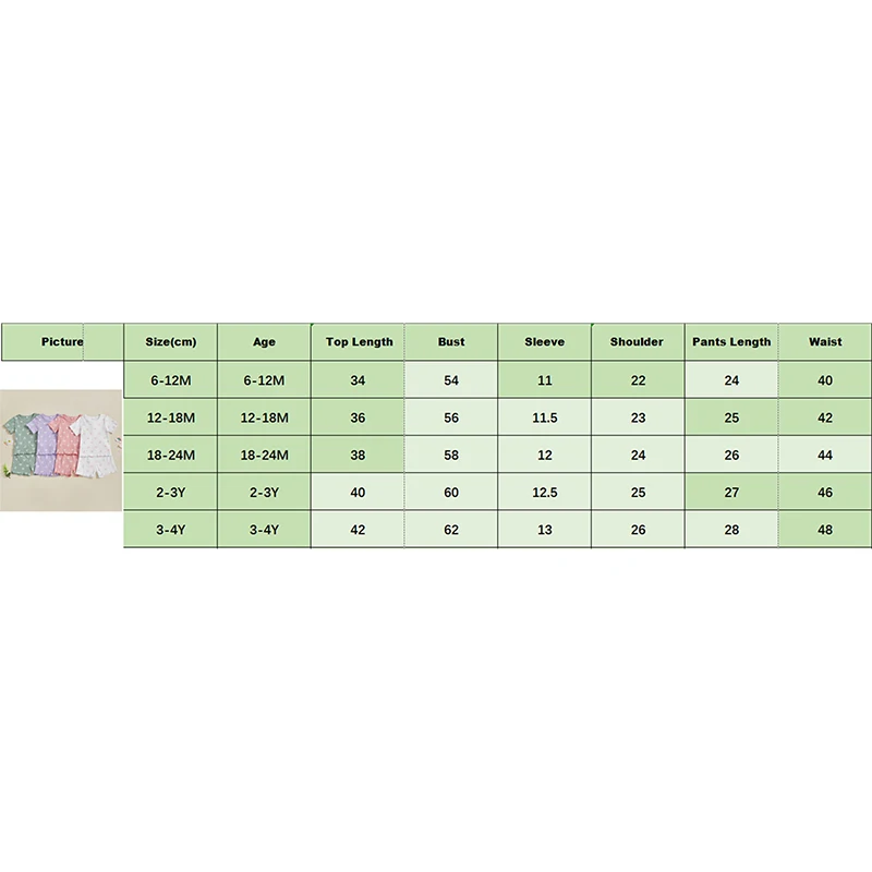 6-12M Tops Length: 34 Bust: 54 Sleeve: 11 Shoulder: 22 Pants Length: 24 Waist: 40 Advised Age: 6–12 Months