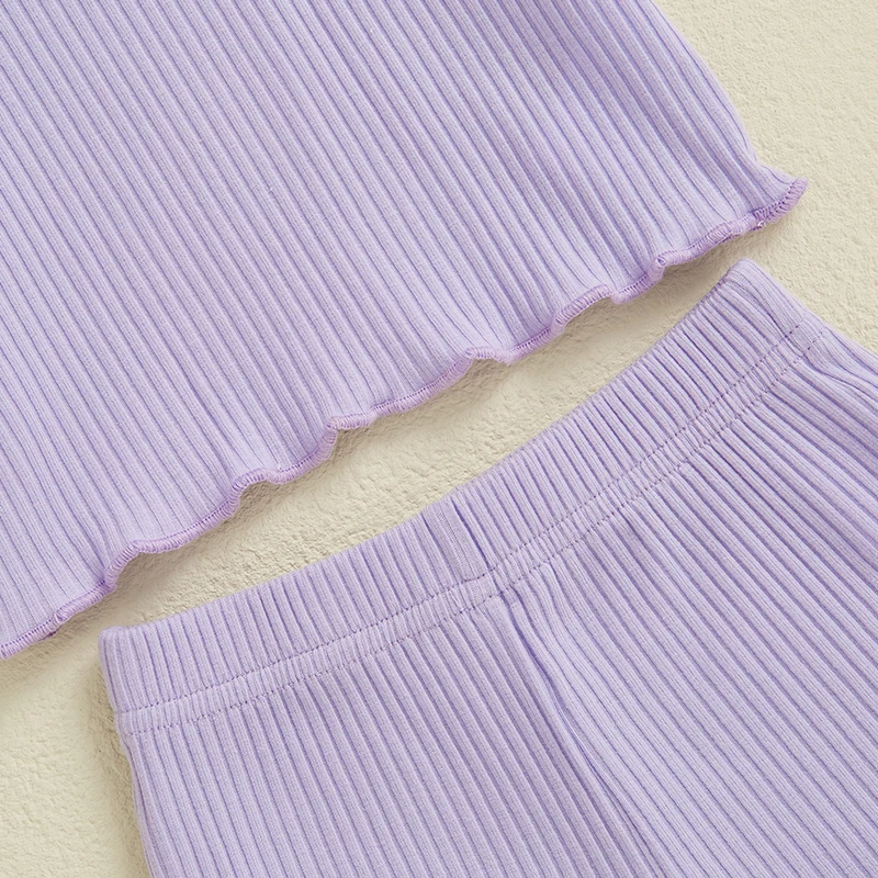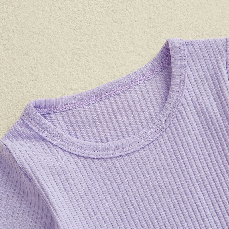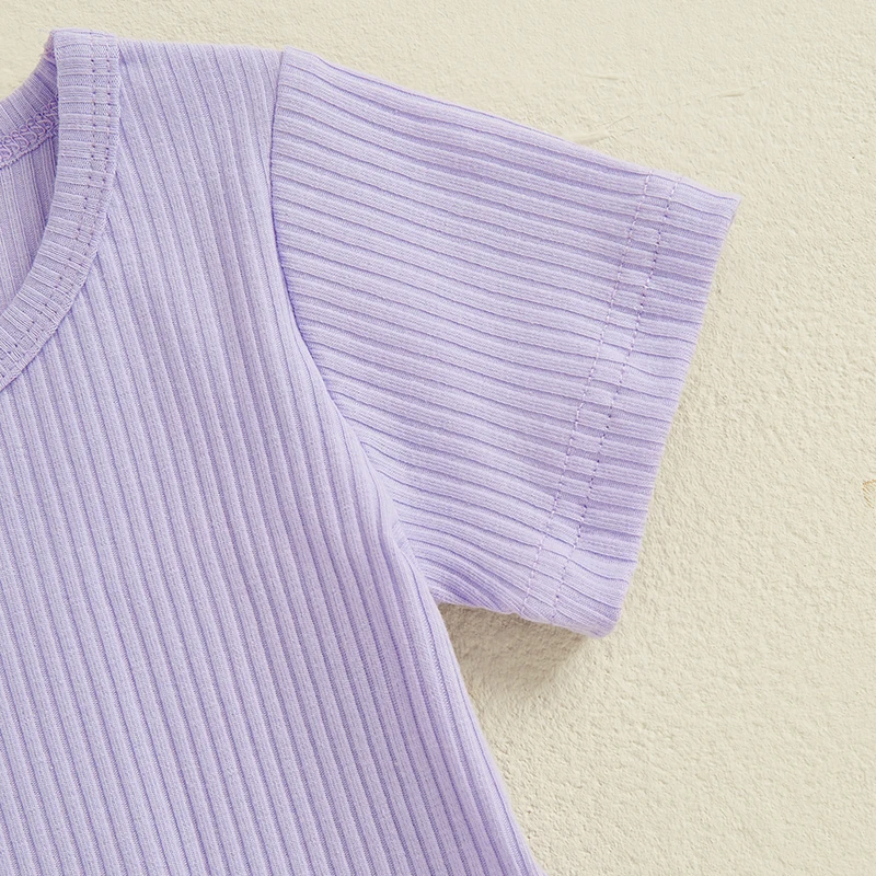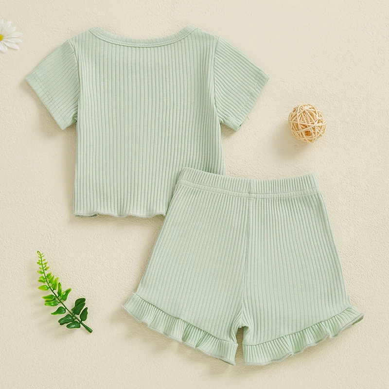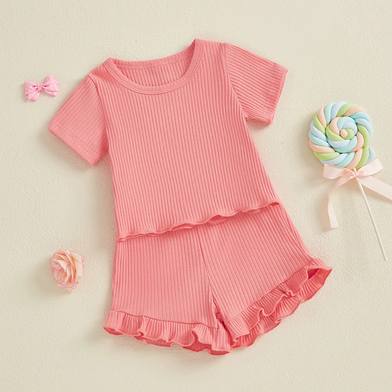 Toddler Baby Girl Ribbed Outfit Solid Color Short Sleeve T-shirts Elastic Waist Ruffle Shorts Set