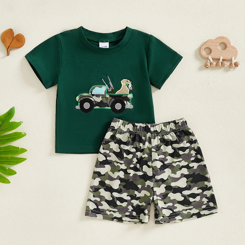 Toddler Baby Boy Summer Outfit Truck Dog Embroidery Short Sleeve T-shirts Camouflage Shorts Set