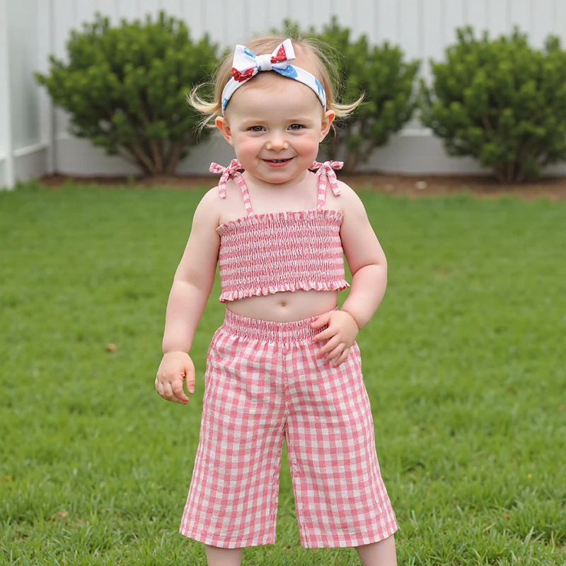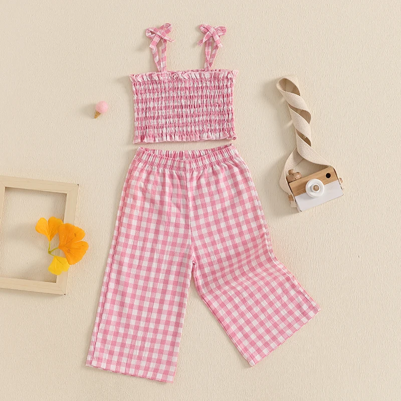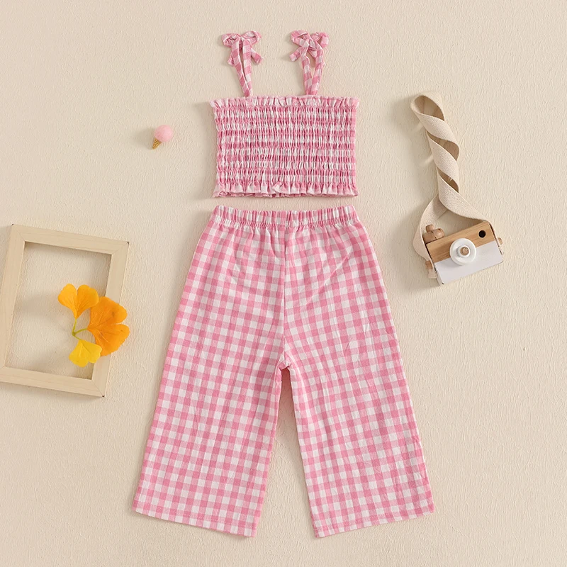 Toddler Baby Girl 2Pcs Summer Outfits Sleeveless Plaid Print Cami Tops + Pants Set Clothes