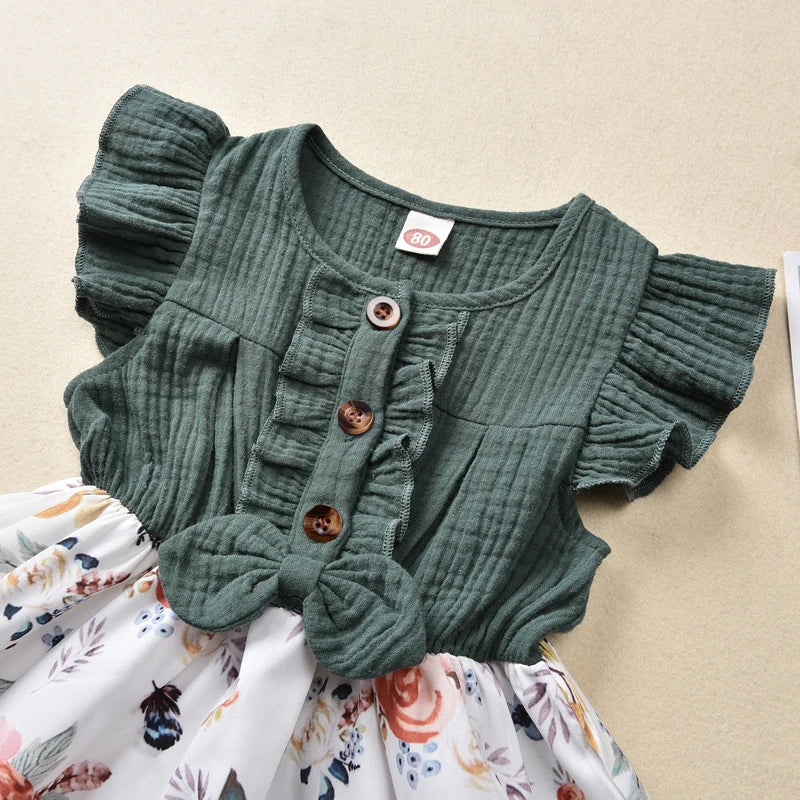 Baby Girls Bowknot Floral Print Ruffles Sleeve Patchwork Length A-Line Sundress