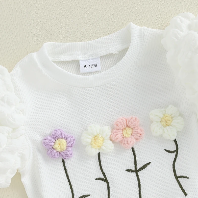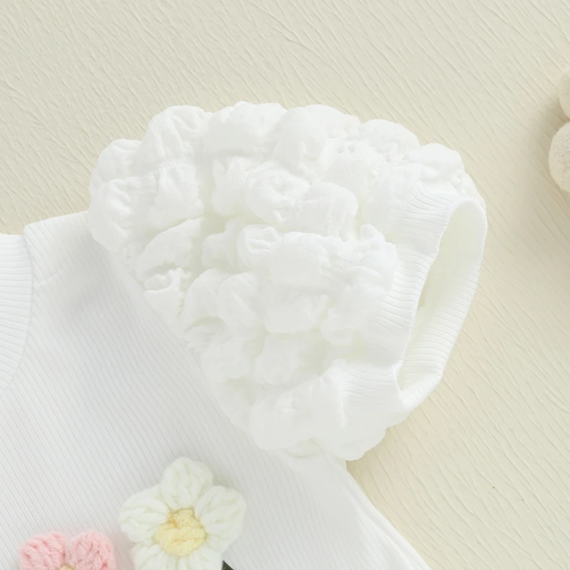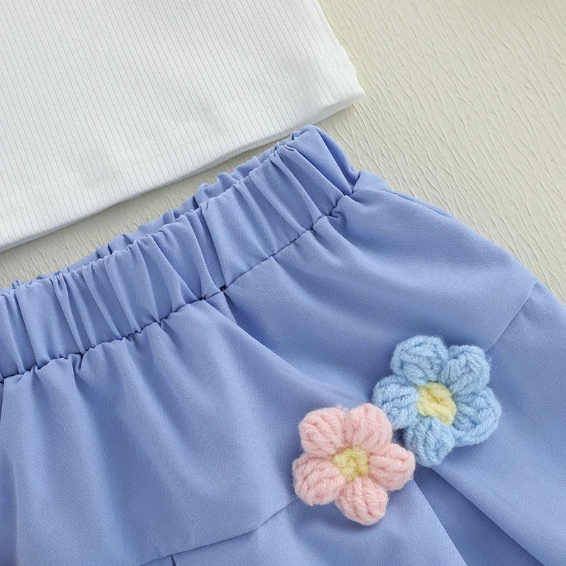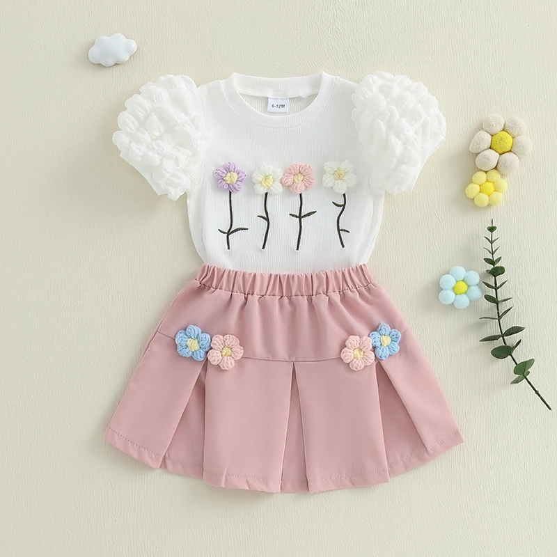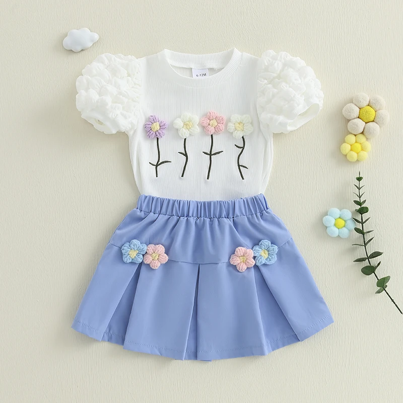 Girls Summer Outfits Crochet Flowers Puff Short Sleeve T-Shirt and Elastic A-Line Skirt Set Toddler Clothes
