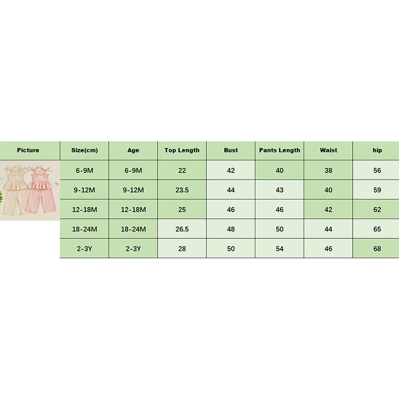 2-3Y Tops Length: 28 Bust: 50 Pants Length: 54 Waist: 46 Hip: 68 Advised Age: 2–3 Years