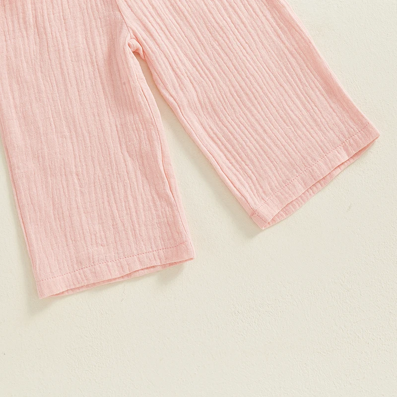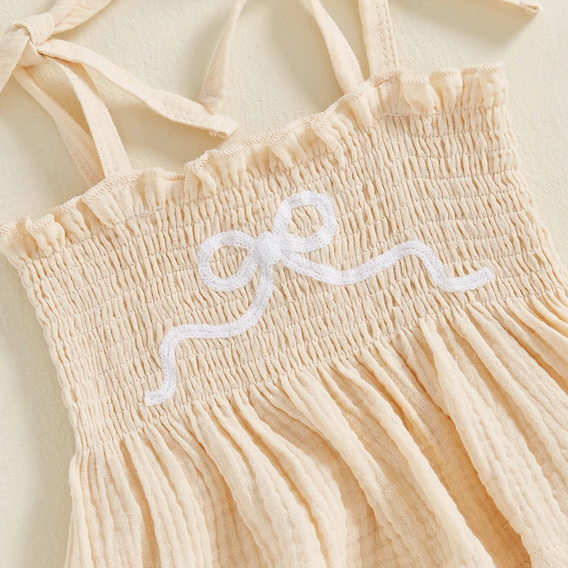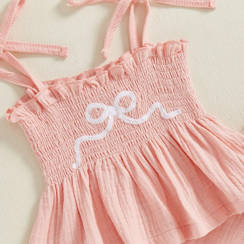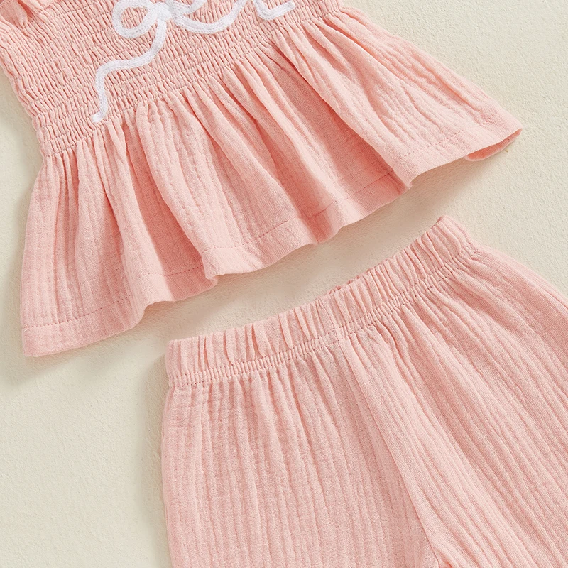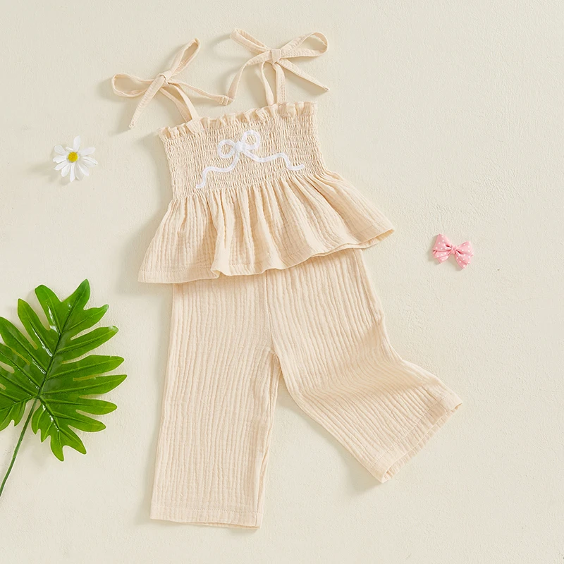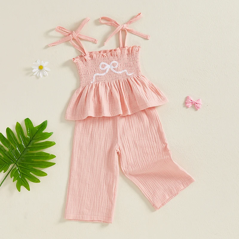 Toddler Baby Girl Set Bow Embroidery Sleeveless Smocked Lacing Strap Camisole Elastic Waistband Pants Outfits